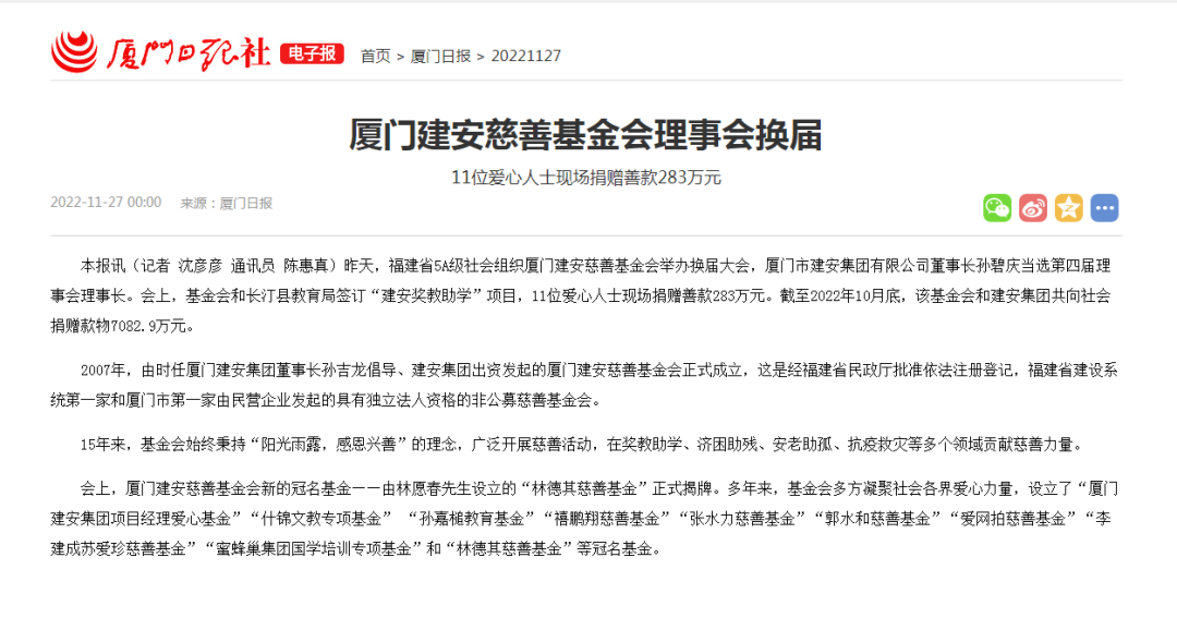 《廈門日報》、《集美報》、《海峽導(dǎo)報》、《海西晨報》等媒體朋友也參加了大會,并對廈門建安慈善基金會換屆大會進行了報道。